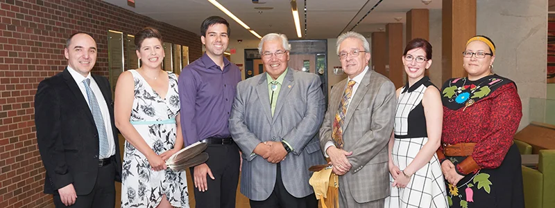 Osgoode Hall Law School held its first annual Honour Ceremony for indigenous graduates in 2015 as part of Spring Convocation celebrations. Pictured are five of the eight indigenous graduates of the Class of 2015 with Justice Murray Sinclair (LLD ‘15) and Justice Harry LaForme (LLB ‘77), (LLD ‘08). From left to right: Joshua Tallman, Serena Dykstra, Jacob Dockstator, Justice Murray Sinclair, Justice Harry LaForme, Kendra d’Eon, Laura Mayer. Photo: Ian Crysler