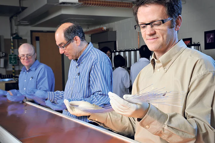Physics professors Dr. Zisis Papandreou (right), Dr. George Lolos and Dr. Andrei Semenov work at the Detector Development Lab at the University of Regina. Department of Photography, University of Regina