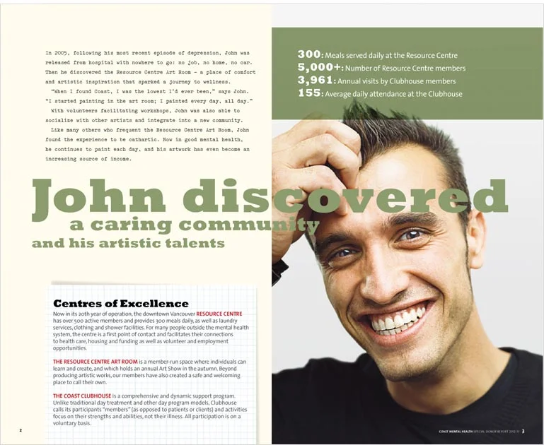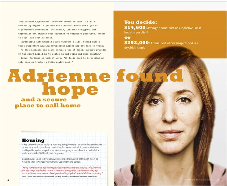 When Vancouver’s Coast Mental Health Foundation asked us to produce its 2014 Report to Donors they challenged us to deliver a product that would not only inform their existing donor base, but also inspire support from prospective donors. Working in collaboration with the foundation’s communications and leadership team, we developed a fresh creative design and content premised on engaging portraiture and real-life stories. The report showcases people whose lives Coast has positively impacted through its various programs and services, and the bottom-line value that Coast brings to our communities.