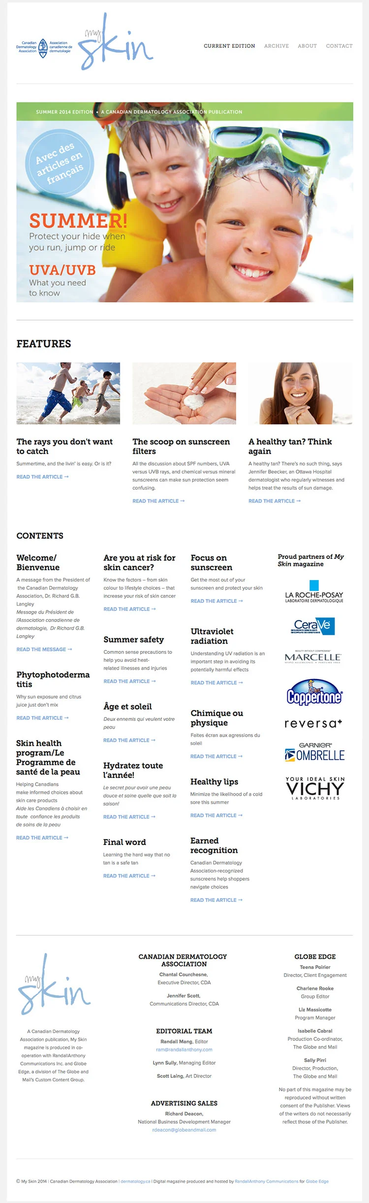 Launched in summer 2013, My Skin magazine quickly earned a reputation as a trusted source of information on skin health. Published by our group on behalf of The Globe and Mail in co-operation with the Canadian Dermatology Association, My Skin magazine educated consumers on matters concerning skin health, and helped reinforce the rightful role of Canadian dermatologists as pre-eminent skin health authorities.